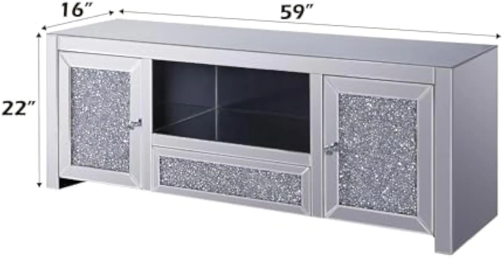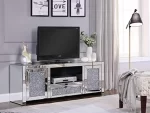 Thelie TV stand will add a contemporary touch to any room in your home. With its clean lines, This brilliant rectangular accent piece showcases a distinctive style for an intriguing look. The unique piece has fully mirrored base and top and fronts finished with a spectacular faux diamond inlay. This Entertainment stand features one drawer, two cabinets and an open media compartment for ample storage and display. Its modern design is a useful addition to any living area. Holds up to a 50” flat screen TV.